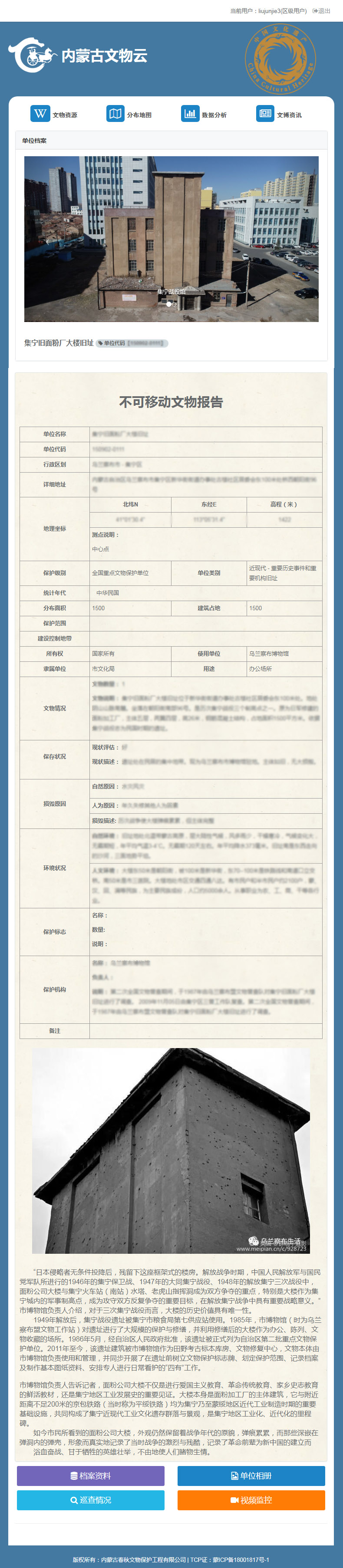 为内蒙古春秋文物公司开发的《春秋文物云》线上可视化信息管理平台+APP,于6月份正式交付使用,该系统集成可视化数据分析、地理标点地图、区域文物查询、文物巡查、文物保护单位档案管理等功能为主,可用于多客户端(PC电脑/微信/手机/平板/app等)的正常访问。平台旨在对内蒙古自治区境内文物保护单位进行地图数字化展示、数据统计、“四有”档案管理、资讯信息发布、电子巡更、安全及安防检测预警等,为各级文物保护部门及个人提供服务。