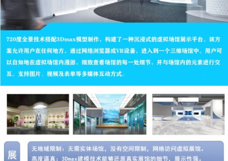 720度全景技术搭配3Dmax模型制作,构建了一种沉浸式的虚拟场馆展示平台。该方案允许用户在任何地方,通过网络浏览器或VR设备,进入到一个三维场馆中。用户可以自如地在虚拟场馆内漫游,细致查看场馆的每一处细节,并与场馆内的元素进行交互。支持图片、视频及表单等多媒体互动方式。...