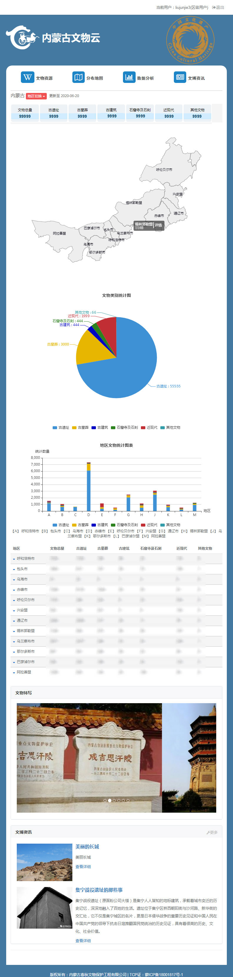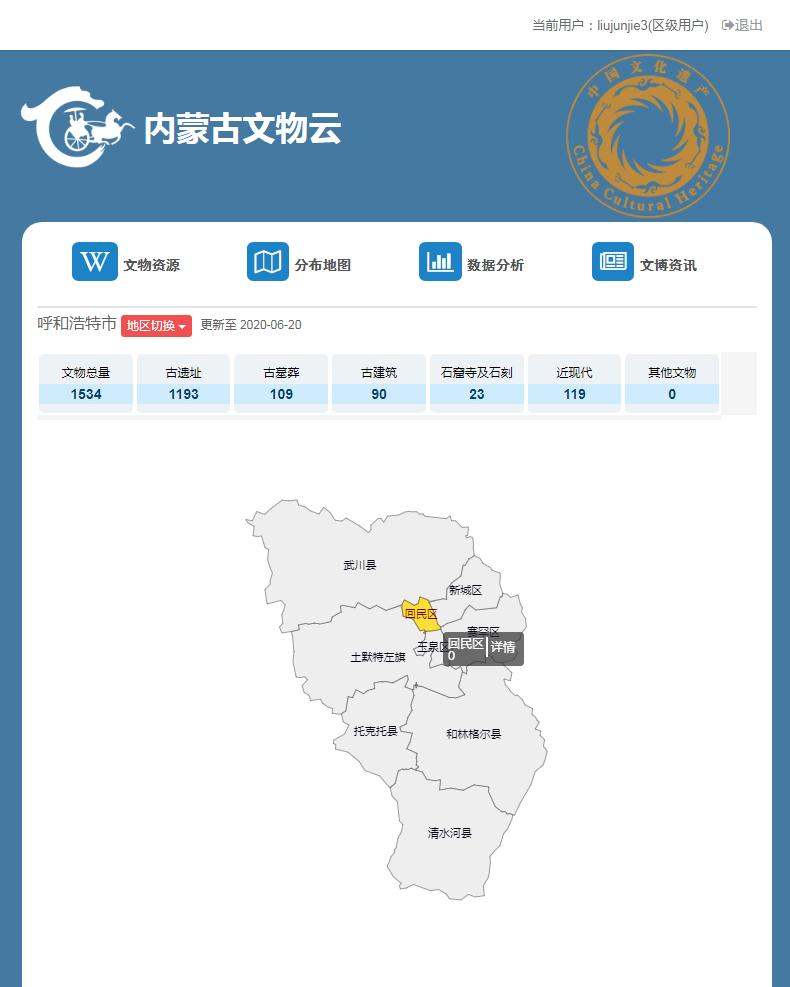 为内蒙古春秋文物公司开发的《春秋文物云》线上可视化信息管理平台+APP,于6月份正式交付使用,该系统集成可视化数据分析、地理标点地图、区域文物查询、文物巡查、文物保护单位档案管理等功能为主,可用于多客户端(PC电脑/微信/手机/平板/app等)的正常访问。平台旨在对内蒙古自治区境内文物保护单位进行地图数字化展示、数据统计、“四有”档案管理、资讯信息发布、电子巡更、安全及安防检测预警等,为各级文物保护部门及个人提供服务。